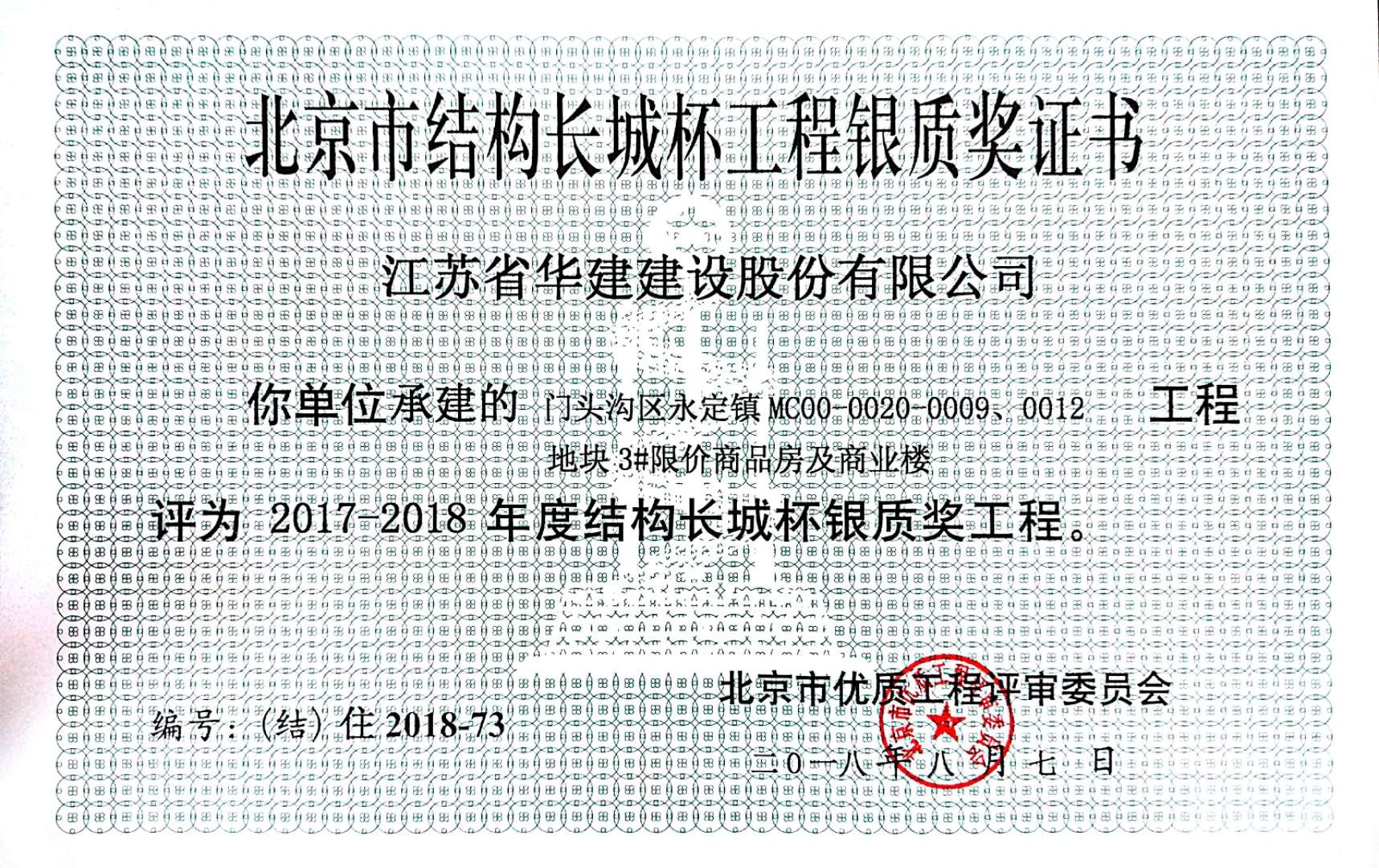 北京公司再獲兩項省級優質結構工程 時間:2018-10-20 3292 近日,北京市工程建設質量管理協會公布了2017-2018年度北京市結構長城杯工程及獲獎單位,由北京公司承建的門頭溝區永定鎮MC00-0020-0009、0012地塊3#限價商品房及商業樓項目獲得結構長城杯銀質獎。 同時,由我司承建的綠城楊柳郡一期17#樓、18#樓、裙房及地下室工程被評定為2018年廣西建設優質結構獎。