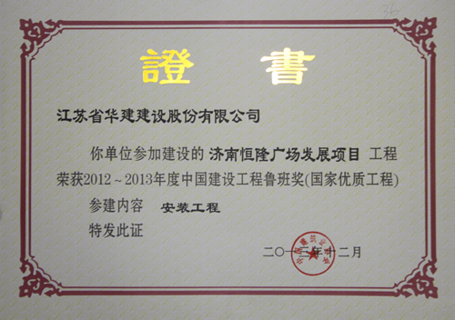 濟南恒隆廣場喜獲“2012-2013年度中國建設工程魯班獎(國家優質工程)” 時間:2013-12-09 5346 12月5日,2012-2013年度中國建設工程魯班獎表彰大會在北京友誼賓館舉行,中國建筑業協會對2012-2013年度國內優秀建筑工程進行了隆重表彰,上海公司參建的濟南恒隆廣場喜獲全國建設工程最高榮譽——“魯班獎”,這是我公司第一次獲此殊榮。江蘇華建副總經理、上海公司總經理楊杰出席了頒獎大會。
