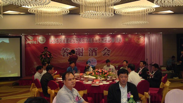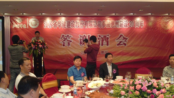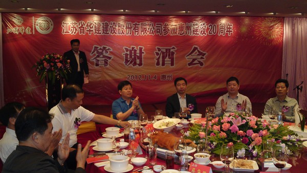 11月4日,公司在惠州凱賓斯基酒店王子飯店隆重召開參加惠州建設20周年慶典暨答謝酒會,公司副董事長、總經理宗有農主持酒會并作開場致辭。惠州市有關政府部門、部分合作方企業的負責人,華建聯盟成員單位負責人,公司董事、監事和高管等130余人出席慶典。惠州公司總經理華恒榮介紹了公司參加惠州建設20年的有關情況。惠州市工商聯主席、公司戰略合作伙伴恒宇實業集團公司董事長楊滿芳代表合作方發言,惠州市住房和城鄉規劃建設局副局長陳訓政代表政府主管部門致辭,分別對江蘇華建進駐惠州施工、參加惠州建設20周年表示祝賀。公司董事長陸金龍代表公司總部對惠州市有關政府部門、相關合作方和社會各界人士給予公司的關心和支持表示誠摯的感謝,并表達了進一步加大支持力度、加強戰略合作、加快科學發展的意愿。