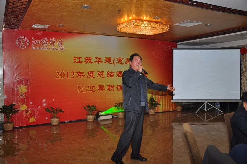 在隨后的迎春聯誼會上,一臺由惠州公司上下精心準備、齊力打造、自編自演的精彩演出,表達出了廣大員工對2012年取得業績的自豪與喜悅,以及對公司美好未來的憧憬與向往。在演出中,由機具處員工莊曙演繹的男聲獨唱,以高亮的美聲唱法,讓在座嘉賓擊掌叫好;四位機關員工表演的三句半《華建style》,詼諧幽默談發展,回顧展望頌華建,讓在場觀眾掌聲不斷;蔡總和華總兩位領導帶頭獻歌,唱出了華建人對事業的激情與豪邁,對未來的堅定與信仰。最后,由宗總、林總兩位總部領導和惠州公司12名男女員工組成的合唱團獻上的一曲《華建之歌》更是將整個活動推向了高潮,臺上的小合唱變成了在場華建人的大合唱,掌聲歡呼聲此起彼伏,年會在歡歌笑語中圓滿結束。新年思變,實干興業,華建人立足惠州,一路高歌,奮勇前行。