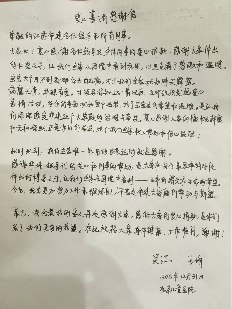 吳江是新加坡蘇揚(yáng)公司的員工,近期他六個月大的兒子被診斷患有白血病,給他的家庭帶來了極大的精神負(fù)擔(dān)和經(jīng)濟(jì)壓力,孩子患病消息也牽動著公司廣大干部員工的心,得知這一消息后,公司黨委高度重視,工會迅速發(fā)起愛心募捐倡議,各單位、各部門廣大干部員工踴躍奉獻(xiàn)愛心,截至目前已經(jīng)籌集愛心捐款十萬余元。吳江特意發(fā)來感謝信,對給予其家庭幫助的同志們表示誠摯感謝!