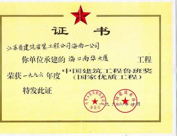 海口市南華大廈工程于1994年5月竣工,1995年6月被評(píng)為海南省優(yōu)質(zhì)樣板工程,1995年12月被評(píng)為建設(shè)部?jī)?yōu)質(zhì)樣板工程,1996年10月榮獲魯班獎(jiǎng)。
