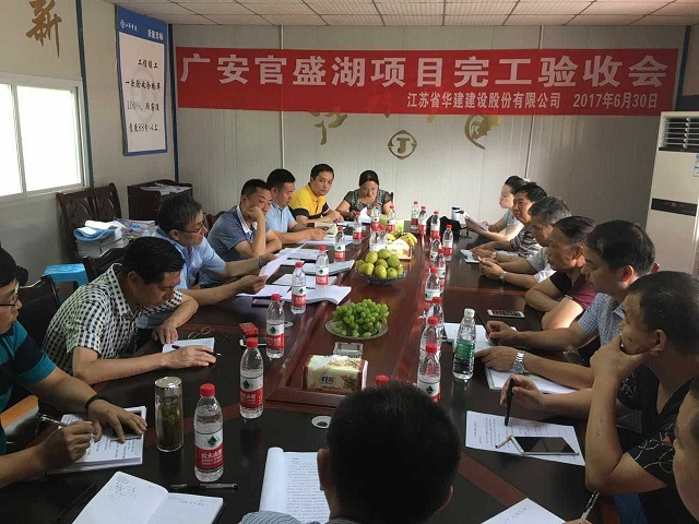華建第一壩——官盛湖大壩工程順利通過完工驗收 時間:2017-07-03 3767 6月30日上午,華建首個水利項目——官盛湖大壩工程完工驗收會在項目會議室召開,廣安官盛新區管委會副主任蔣成文主持會議。經項目勘察、設計、監理、區住建局、質監站、水務局、發改局、財政局等單位和業主現場代表實測檢查、分別總結匯報后,一致同意工程驗收合格。 官盛湖大壩作為一項以城市景觀為主、兼有防洪功能的綜合性水利工程,主要由樞紐工程、泄洪渠工程組成。官盛湖湖區總庫容987.73萬立方米,壩頂長349米,最大壩高48.5米,壩體填筑總量達157.93萬方。