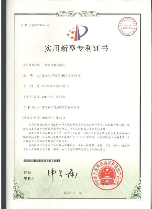 三項(xiàng)實(shí)用新型成果分別是:1、《一種預(yù)留洞用模具》(專利號(hào):ZL201420647560.1,專利權(quán)人:孔令正、嚴(yán)正濤、楊玉飛、郭冬冬);2、《一種型鋼混凝土的模板支撐結(jié)構(gòu)》(專利號(hào):ZL201420647633.7,專利權(quán)人:孔令正、楊玉飛、曹亞明、郭冬冬);3、《一種塔式起重機(jī)附著伸縮撐桿》(專利號(hào):ZL201420647600.2,專利權(quán)人:孔令正、楊玉飛、曹亞明、湯文平)。