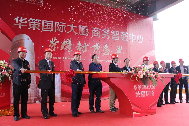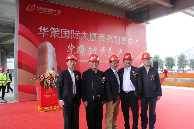2017年1月9日,第八項目部承擔施工任務的華策國際大廈項目舉行主體結構封頂儀式。橫琴新區黨委副書記葉真、橫琴新區建設環保局局長劉晨光華策集團董事局主席楊峰、副主席楊智雄、總裁余道群江蘇華建副董事長、總經理宗有農、珠海公司總經理繆國樞、深圳公司常務副總吳碧橋、深圳公司副總經理蔣超,以及來自華策集團、設計單位、參建單位、監理單位和珠海區域公司相關人員共200余人出席儀式。華策國際大廈整體分為東塔和西塔兩部分,西塔已于2016年11月8日封頂,隨著東塔的順利封頂,華策國際大廈全面封頂,并將于2017年部分投入使用,2018年底全部投入使用。
