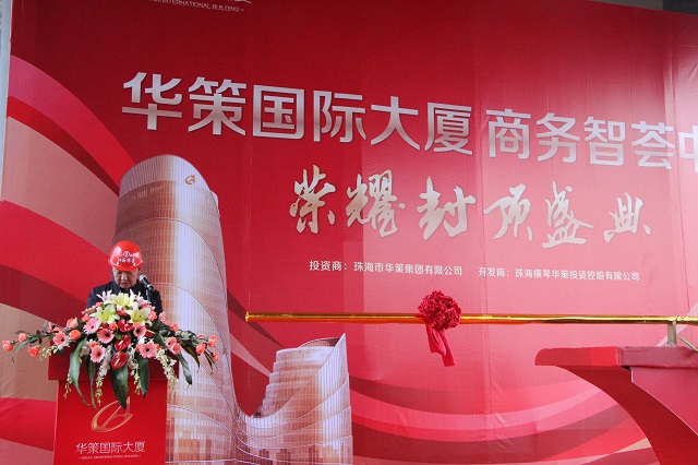 儀式上繆國樞總經理代表總包單位發言,繆總對華策國際大廈工程實現全面順利封頂表示最熱烈的祝賀!向日夜奮戰在施工現場的全體參建者表示最衷心的感謝!繆總表示,主體結構全面封頂只是階段性的勝利,以后的工作仍然任重而道遠。公司將一如既往地秉承“鑄造精品、追求卓越”的華建精神,科學組織、精心施工、嚴格把關,確保高標準、高質量地完成項目施工任務,將本工程打造成橫琴自貿區一項奪目的建筑藝術品。
