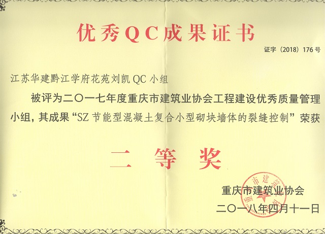 近日,重慶市建筑業協會發文表彰了一批優秀QC成果,江蘇華建黔江學府花苑劉凱QC小組被評為2017年度重慶市工程建設優秀質量管理小組,其成果“SZ節能型混凝土復合小型砌塊墻體的裂縫控制”榮獲二等獎。