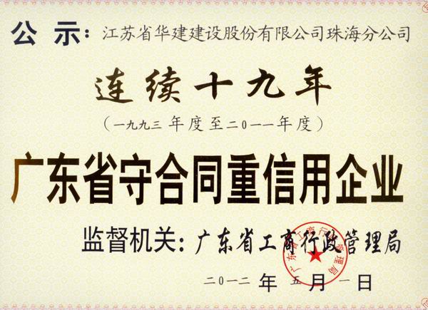 公司連續(xù)19年榮獲“廣東省守合同重信用企業(yè)”榮譽(yù)稱號