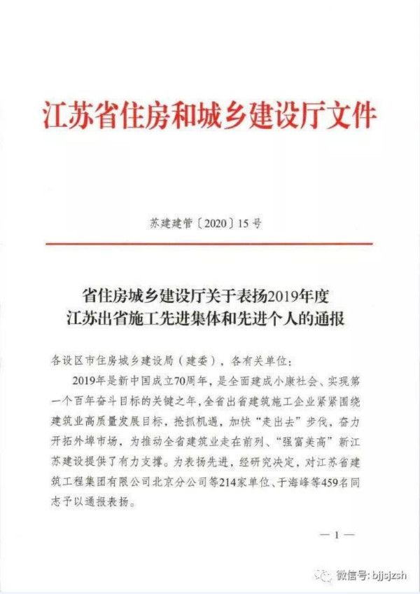 近日,江蘇華建北京分公司被江蘇省住建廳表彰為“2019年度出省建筑施工先進(jìn)集體”。當(dāng)前疫情...