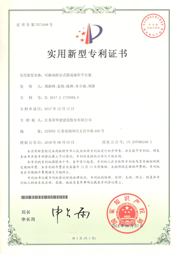 近日,從國家知識產權局傳來喜訊,北京公司發布的《可移動拆分式簡易操作平臺架》(專利號:ZL...