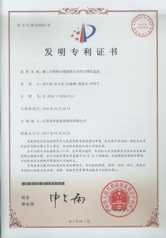 日前,公司又一項(xiàng)發(fā)明專利獲得國(guó)家知識(shí)產(chǎn)權(quán)局授權(quán),此項(xiàng)專利名稱為“施工升降機(jī)電纜儲(chǔ)筒全封閉自...