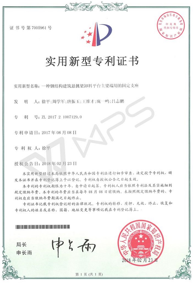 近日,從國(guó)家知識(shí)產(chǎn)權(quán)局傳來(lái)喜訊,公司申請(qǐng)的《一種鋼結(jié)構(gòu)建筑懸挑梁卸料平臺(tái)主梁端用的固定支座...