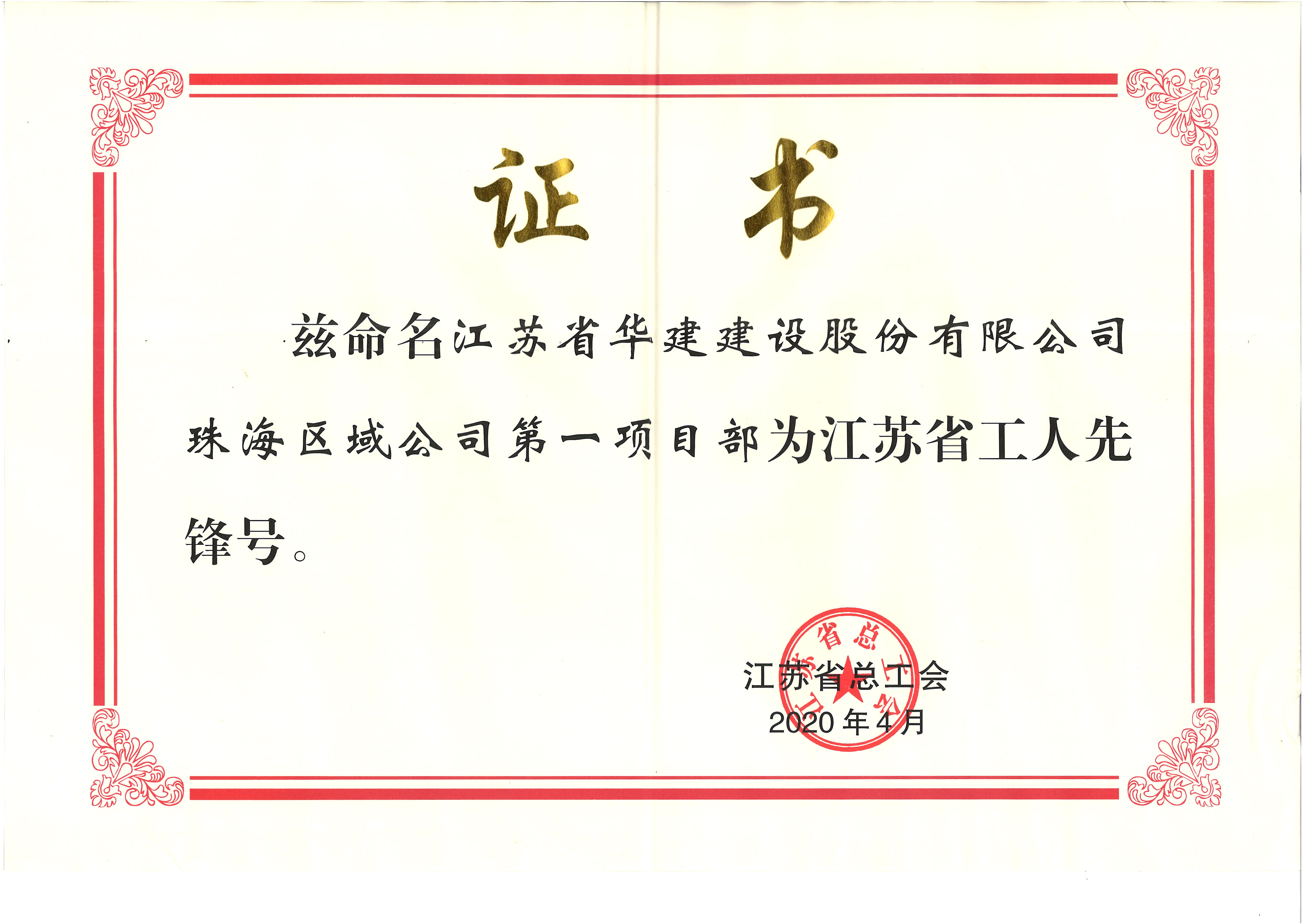 珠海區域公司第一項目部獲江蘇省工人先鋒號