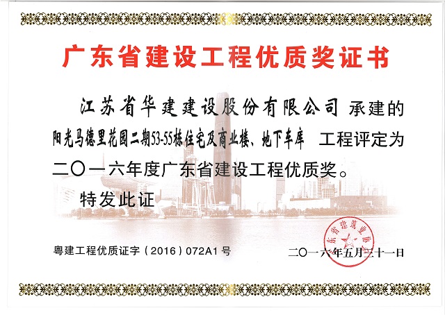 2016年度陽光馬德里53-55棟建設(shè)工程廣東省優(yōu)質(zhì)獎(jiǎng)