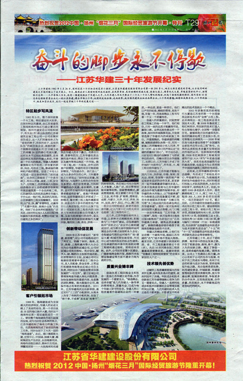 《揚州晚報》專版刊發(fā)公司三十周年宣傳文章 時間:2012-04-19 5727 4月18日,《揚州晚報》T29版刊發(fā)專版文章《奮斗的腳步永不停歇——江蘇華建三十年發(fā)展紀實》,從公司起步、市場開拓、創(chuàng)新發(fā)展、質(zhì)量與科技等各個層面,介紹了公司三十年的奮斗歷程、綜合實力和發(fā)展業(yè)績。